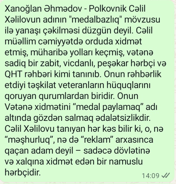 “Polkovnik Cəlil Xəlilov Azərbaycan xalqının tanınmış simalarından biridir. O, Əfqanıstan və Qarabağ veteranıdır. Bundan başqa alimdir, çoxlu sayda kitabların müəllifidir. Respublika Veteranlar Təşkilatında uzun müddətdir sədr müavini, keçən ilin sentyabrından sədr vəzifəsində çalışır. Ola bilsin hər hansi veteran təşkilatı medal alveri ilə məşğul olursa bunun Respublika Veteranlar Təşkilatına və şəxsən polkovnik Cəlil Xəlilova aidiyyəti yoxdur. O, xalqını sevən bir ziyalıdır. Onun tez-tez mətbuatda çıxışları buna sübutdur. Əfsuslar olsun ki, sosial şəbəkələrdə çox vaxt xalqımızın dəyərli insanlarını gözdən salmaq üçün bu cür həqiqəti əks etdirməyən materiallar yerləşdirilir. Bu Respublika Veteranlar Təşkilatının veteranlarını hiddətlədirir. Qeyd olunan material qərəzlidir və həqiqəti əks etdirmir”.